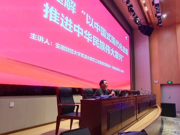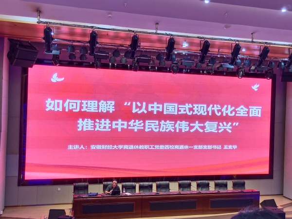 为进一步深化主题教育,强化党员示范引领作用,6月29日上午,龙湖西校区离退休一支部、四支部组织党员赴蚌埠城投康养中心开展党建共建活动,该活动主要分为支部书记讲党课和观看红色电影两个部分,我校和蚌埠城投康养中心共40余名党员参加。 在影音室,我校离退休第一党支部书记王支华作题为“如何理解‘以中国式现代化全面推进中华民族伟大复兴’”主题教育专题党课。王支华从“中国式现代化提出的时代背景”“深刻把握中国式现代化的中国特色”“牢牢把握中国式现代化的本质要求”三个方面对“中国式现代化”进行深入的阐述。他强调,只有矢志不渝沿着中国式现代化这条强国建设、民族复兴的正确道路奋勇前进,才能在实现中华民族伟大复兴征程上创造新的伟大奇迹。最后,王支华号召老党员们要与党中央和各级党委保持高度一致,认真学习贯彻习近平新时代中国特色社会主义思想,深刻领悟“两个确立”的决定性意义,不断增强“四个意识”、坚定“四个自信”、做到“两个维护”,在身体条件允许的前提下,努力在家风建设和下一代思想政治等方面老有作为,充分发挥正能量引领作用,以实际行动促进中国式现代化朝着正确方向稳步推进。 党课结束后,老党员们集体观看红色影片《望道》,该电影以《共产党宣言》中文全译本翻译陈望道为叙事核心,用生动的镜头语言,向观众展示了觉醒年代一批先进知识分子坚守真理与信仰,舍生忘死的热血故事。观影的老党员们深受鼓舞,备受感动。 此次党建共建活动是我校离退休党支部学习贯彻习近平新时代中国特色社会主义思想主题教育的有益尝试,加强了老党员们的交流合作,激发了离退休党建工作活力,下一步,离退休教职工党委将继续严格落实学习贯彻习近平新时代中国特色社会主义思想主题教育各项工作要求,不断创新支部活动方式,积极引领离退休老同志听党话、跟党走,为学校高质量发展贡献余热力量。(撰稿:离退休工作处纪然;审核:离退休工作处张金梅)
